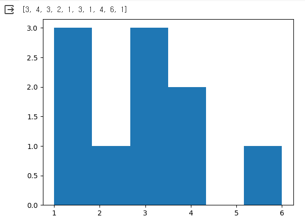 ๋ง์ง๋ง์ผ๋ก, dice ๋ฆฌ์คํธ์ ์ ์ฅ๋ ๊ฒฐ๊ณผ๋ฅผ ํ์คํ ๊ทธ๋จ์ผ๋ก ์ถ๋ ฅํ๋ค. ์ด๋, ์ฃผ์ฌ์์ ๋๊ธ์ด x์ถ์, ํด๋น ๋๊ธ์ด ๋์จ ํ์๊ฐ y์ถ์ ํ์๋๋ค.
