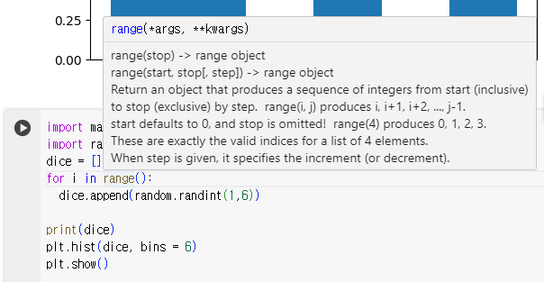 ์ด์ด์, ์ฃผ์ฌ์๋ฅผ ์ฒ ๋ฒ ๊ตด๋ ธ์ ๋์ ๊ฒฐ๊ณผ๋ฅผ ๊ธฐ๋กํ๊ธฐ ์ํด dice = []๋ก ๋ฆฌ์คํธ๋ฅผ ๋น์์ค๋ค. ๊ทธ๋ฆฌ๊ณ ๋ 1000๋ฒ์ ์ฃผ์ฌ์ ๊ตด๋ฆฌ๊ธฐ๋ฅผ ํ๊ณ ๊ทธ ๊ฒฐ๊ณผ๋ฅผ dice ๋ฆฌ์คํธ์ ์ ์ฅํ๋ค.