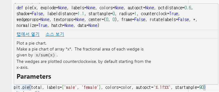 - plt.pie(total, labels=['male', 'female'], colors=color, autopct='%.1f%%', startangle=90): ์ํ ๊ทธ๋ํ๋ฅผ ์์ฑ.