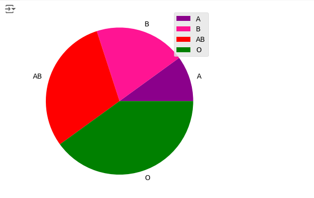 - plt.pie([10,20,30,40], labels=label, colors=color): plt.pie() ํจ์๋ฅผ ์ฌ์ฉํ์ฌ ํ์ด ์ฐจํธ๋ฅผ ์์ฑํ๋ค. ๊ฐ ํ์กํ ์ ํ์ ํด๋นํ๋ ๋ฐ์ดํฐ๋ [10, 20, 30, 40]๋ก ์ค์ ๋์ด ์๊ณ , ์ด๋ ๊ฐ ํ์กํ ์ ํ์ ๋ํ ๋น์จ์ ๋ํ๋ธ๋ค. ์๋ฅผ ๋ค์ด, 'A'ํ์ด 10%, 'B'ํ์ด 20%, 'AB'ํ์ด 30%, 'O'ํ์ด 40%๋ฅผ ์ฐจ์งํ๋ค๋ ๊ฒ์ ์๋ฏธํ๋ค.
