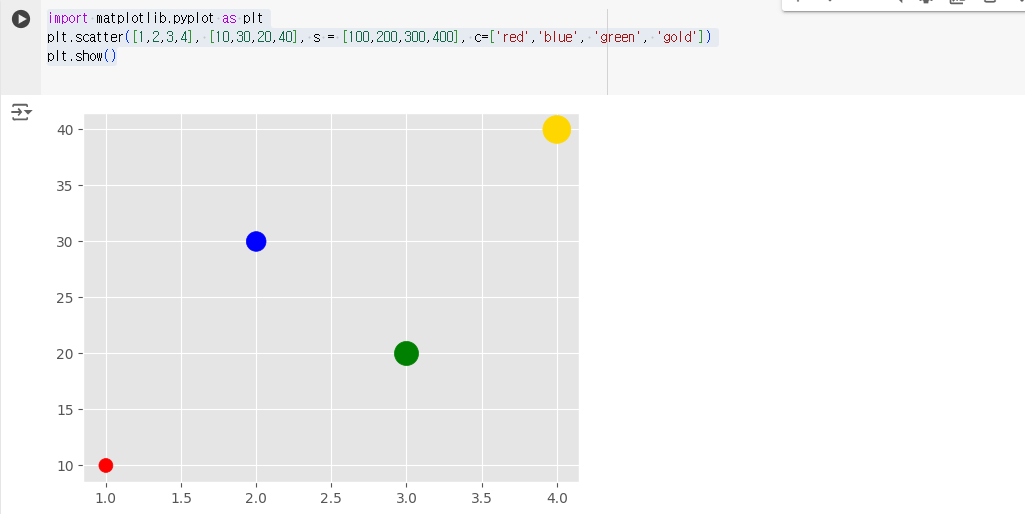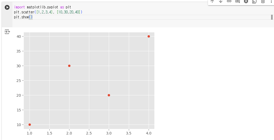 ์ ์ฝ๋๋ ํ์ด์ฌ์ Matplotlib ๋ผ์ด๋ธ๋ฌ๋ฆฌ๋ฅผ ์ฌ์ฉํ์ฌ ์ฐํฌ๋(์ฐ์ ๋)๋ฅผ ๊ทธ๋ฆฌ๋ ์์์ด๋ค. ์ฐํฌ๋๋ ๋ฐ์ดํฐ์ ๋ถํฌ๋ฅผ ์๊ฐํํ๋๋ฐ ์ฌ์ฉ๋๋ค. ์ฌ๊ธฐ์๋ x์ถ์๋ 1, 2, 3, 4๋ฅผ, y์ถ์๋ 10, 30, 20, 40์ ๋ํ๋ด๋ ๋ค ๊ฐ์ ์ ์ ํ์ํ๋ค.