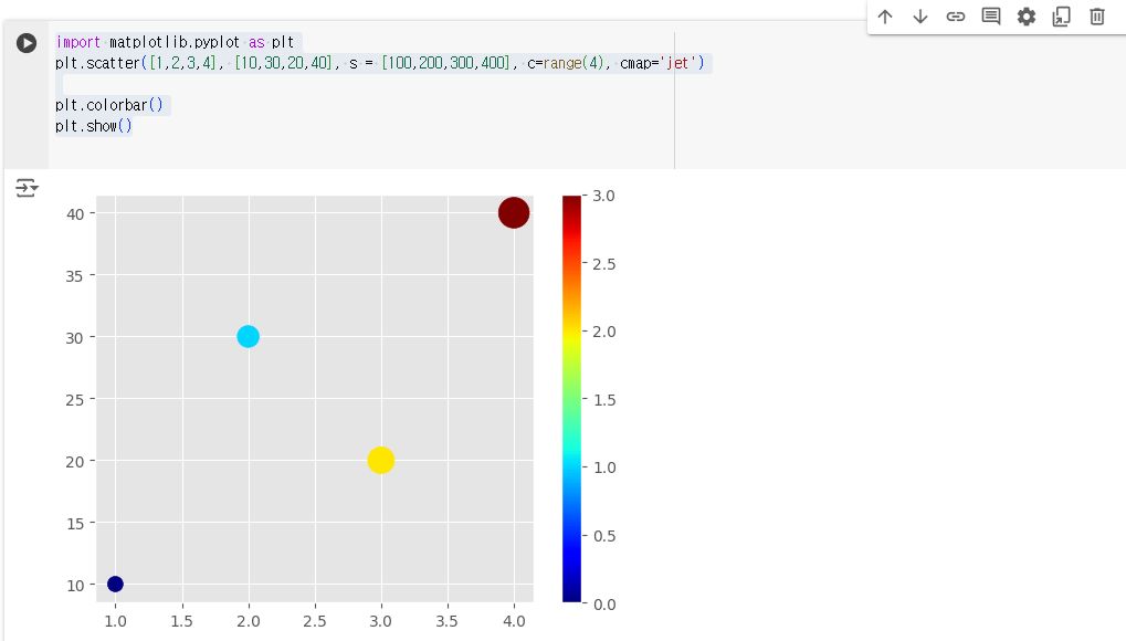 ๊ทธ๋ํ์์๋ ๋ฐ์ดํฐ์ ํฌ๊ธฐ์ ๋ฐ๋ผ ๋ง์ปค์ ํฌ๊ธฐ๊ฐ ๋ค๋ฅด๊ณ , colors์ ๋ฐ๋ผ ์์์ด ๋ณํ๋ค. ์ปฌ๋ฌ ๋ฐ๋ ์ด ์์์ ํ์ํ๋ฉฐ, ์ปฌ๋ฌ๋งต์ ์ด๋ฌํ ๊ฐ์ ์ด๋ป๊ฒ ์์์ผ๋ก ๋ณํํ ์ง๋ฅผ ๊ฒฐ์ ํ๋ค.