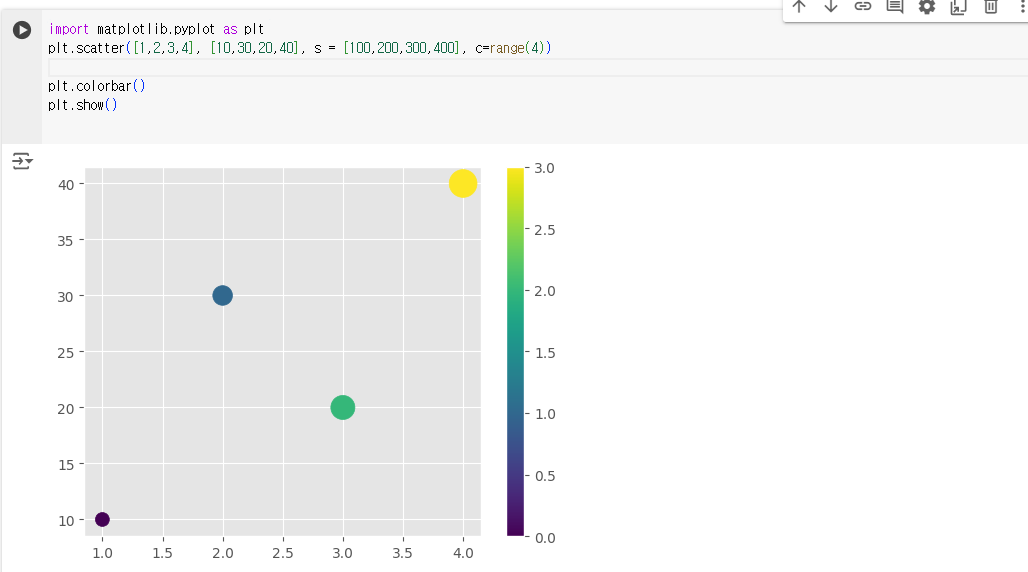 ์ ์ฝ๋์์๋ c=range(4)๋ก ์ปฌ๋ฌ ๋ฐ์ ์ฌ์ฉ๋ ์์์ ์๋์ผ๋ก ์ง์ ํ๋ค. ์ปฌ๋ฌ ๋ฐ๋ ๋ฐ์ดํฐ์ ๋ฒ์๋ฅผ ๋ํ๋ด๋๋ฐ ์ฌ์ฉ๋๋ค. ์ด๊ฒ์ผ๋ก ๊ฐ ๋ฐ์ดํฐ ํฌ์ธํธ๊ฐ ์ด๋ค ๋ฒ์์ ์ํ๋์ง ์๊ฐ์ ์ผ๋ก ํ์ ํ ์ ์๋ค.