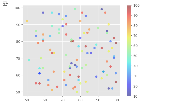 ๋ง์ง๋ง์ผ๋ก, plt.scatter() ํจ์๋ฅผ ์ฌ์ฉํ์ฌ ์ฐ์ ๋๋ฅผ ๊ทธ๋ฆฐ๋ค. ์ด ํจ์๋ x์ y ์ขํ๋ฅผ ๋ฐ์๋ค์ด๊ณ , ๊ฐ ์ ์ ํฌ๊ธฐ๋ size ๋ฆฌ์คํธ์ ๊ฐ์ ๋ฐ๋ผ ๊ฒฐ์ ๋๋ค. ๊ทธ๋ฆฌ๊ณ plt.show() ํจ์๋ฅผ ํธ์ถํ์ฌ ์ฐ์ ๋๋ฅผ ํ๋ฉด์ ํ์ํ๋ค.