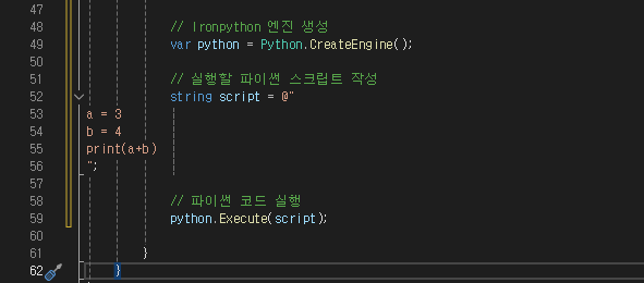 μ΄ μ½λλ C#μμ IronPython μμ§μ μ¬μ©νμ¬ μ½λλ₯Ό μ€ννλ μμμ΄λ€. νμ΄μ¬ μ€ν¬λ¦½νΈλ C# μ½λ μμμ λ¬Έμμ΄λ‘ μ μλκ³ , C#μ λ¬Έμμ΄ λ΄μ νμ΄μ¬ μ½λλ₯Ό μμ±ν μ μλ€. μ΄λ κ² νλ©΄ C#μμ νμ΄μ¬ μ½λλ₯Ό μ§μ μμ±νκ³ μ€νν μ μλ€.