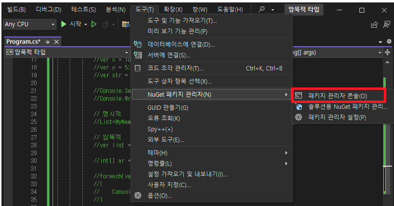 λꡬ> NuGet ν¨ν€μ§ κ΄λ¦¬μ > ν¨ν€μ§ κ΄λ¦¬μ μ½μ