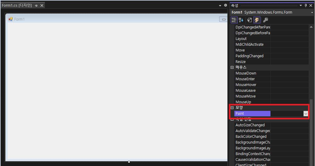 ํผ ์ ํ ํ paint ์ด๋ฒคํธ๊ฐ ์๋ค. ์์ฑ์์ ๋๋ธ paint๋ฅผ ๋๋ธํด๋ฆญํ๋ฉด, ์ด๋ฒคํธ ํธ๋ค๋ฌ ์์ฑ