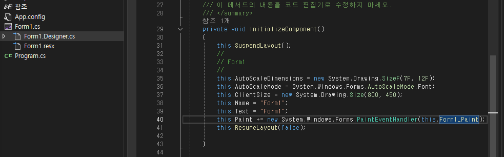Form1.Designer.cs ๊ฐ๋ฉด PaintEventHandler๊ฐ ๋ฐ์์ด ๋์์๋, form1_Paint๊ฐ ํธ์ถ๋๋๋ก ์ฐ๊ฒฐ ๋์ด์๋ค.
