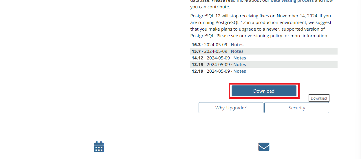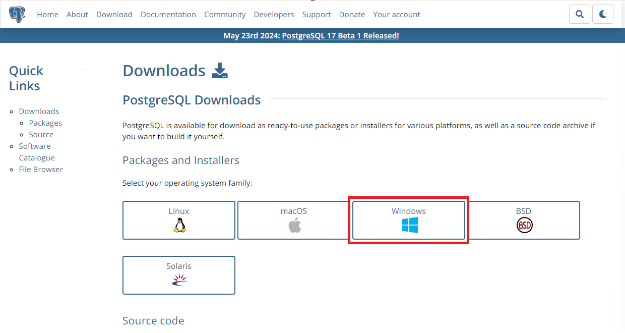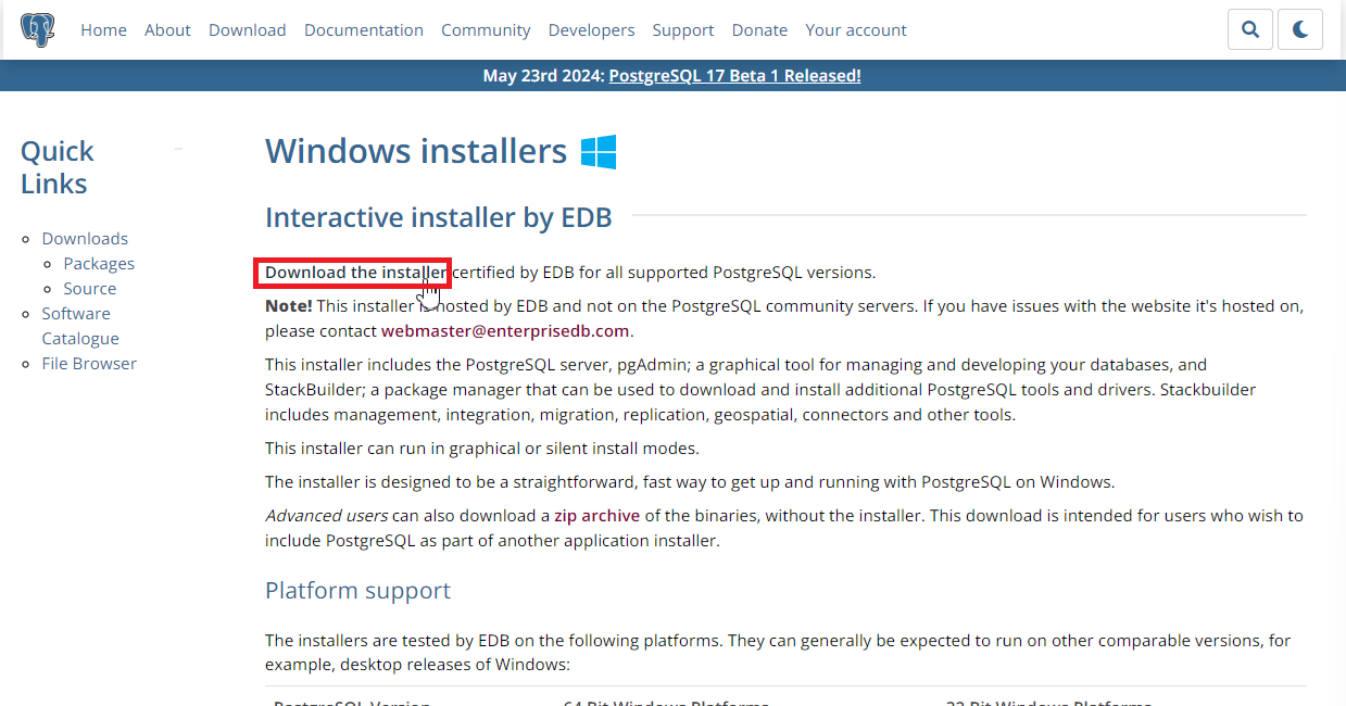 ๋จผ์ PostgreSQL ๊ณต์ ์น์ฌ์ดํธ์์ ์ค์น ํ์ผ์ ๋ค์ด๋ก๋ํด์ผ ํฉ๋๋ค. ์๋ ๋งํฌ๋ฅผ ํด๋ฆญํ์ฌ ๋ค์ด๋ก๋ ํ์ด์ง๋ก ์ด๋ํฉ๋๋ค.