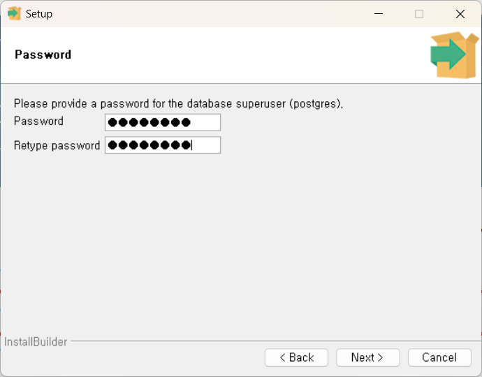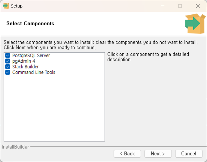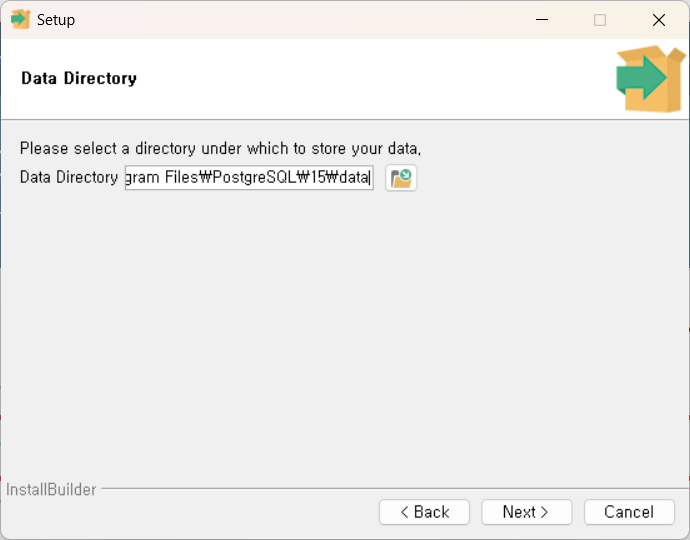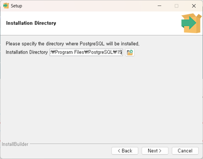 PostgreSQL์ด ์ค์น๋ ๊ฒฝ๋ก๋ฅผ ์ง์ ํฉ๋๋ค. ๊ธฐ๋ณธ ๊ฒฝ๋ก๋ฅผ ์ฌ์ฉํ๊ฑฐ๋ ์ํ๋ ๊ฒฝ๋ก๋ฅผ ์ง์ ํ ํ 'Next'๋ฅผ ํด๋ฆญํฉ๋๋ค.