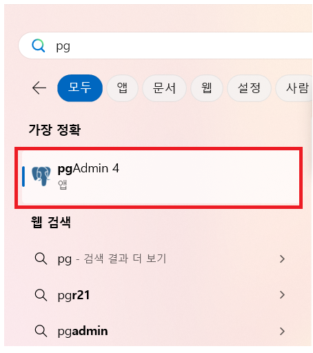 ์์์ฐฝ์์ pg๋ง ์ ๋ ฅํ๋ฉด pgAdmin4๋ฅผ ์คํํฉ๋๋ค. pgAdmin์ PostgreSQL์ ๊ด๋ฆฌํ ์ ์๋ GUI ํด์ ๋๋ค.