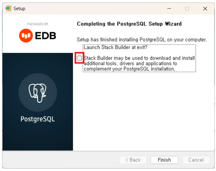 ์ค์น๊ฐ ์๋ฃ๋๋ฉด Stack Builder๋ ์ฒดํฌ ํด์ ํ๊ณ 'Finish' ๋ฒํผ์ ํด๋ฆญํ์ฌ ์ค์น ๋ง๋ฒ์ฌ๋ฅผ ์ข ๋ฃํฉ๋๋ค. ์ด์ PostgreSQL์ด ์ ์์ ์ผ๋ก ์ค์น๋์๋์ง ํ์ธํด๋ณด๊ฒ ์ต๋๋ค.