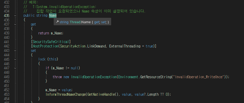 F12 + Name μμλ μ€λ λμ μ΄λ¦μ μ€μ νλ Nameμ΄ get,setμ νλ‘νΌν°λ‘ ꡬμ±λμ΄ μλ€. th.Name = "μ΄λ¦"; set nameμ΄ λ°λλμ value κ°μ΄ μ λ ₯λλ€.