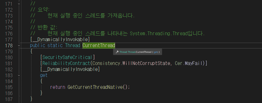F12 + CurrentThread κ°μ²΄λ₯Ό 보면 νμ¬ μ€νλλ μ€λ λλ₯Ό 보μ¬μ€λ€. μ μ μΈ λ©μλλ‘ get,set νλ‘νΌν°(get,setμ νλλ‘ λ§λ κ²)μ΄λ€. C++μμλ Thread th = Thread::CurrentThread; μ κ°μ΄ νΈμΆνλ€.