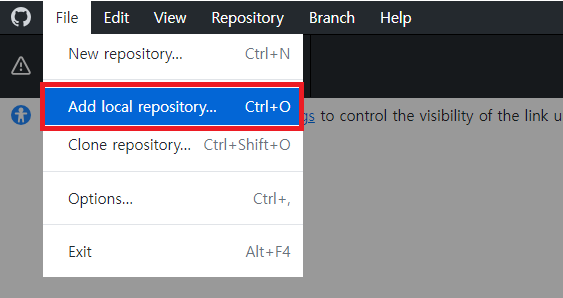 - ์๋จ ๋ฉ๋ด์์ File > Add local repository ๋๋ ๋จ์ถํค Ctrl + O๋ฅผ ์ ํํ๋ค.