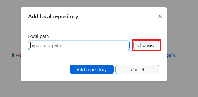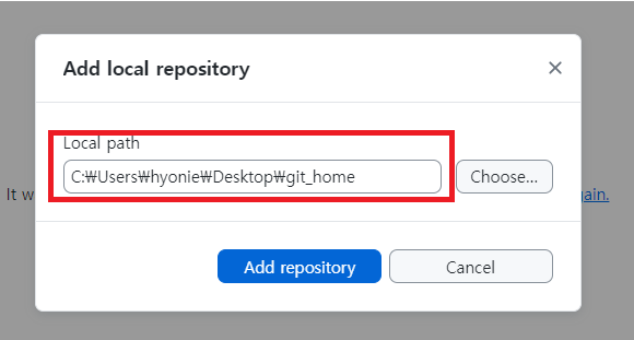 - Add local repository ๋ํ ์์๊ฐ ์ด๋ฆฌ๋ฉด, Local path์์ GitHub Desktop์ผ๋ก ๊ฐ์ ธ์ฌ ๋ฆฌํฌ์งํ ๋ฆฌ ํด๋๋ฅผ ์ ํํ๋ค.
