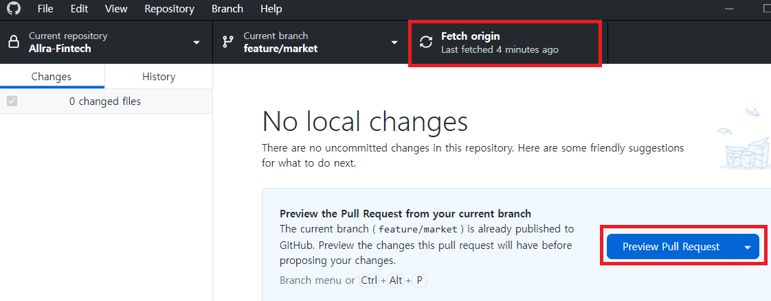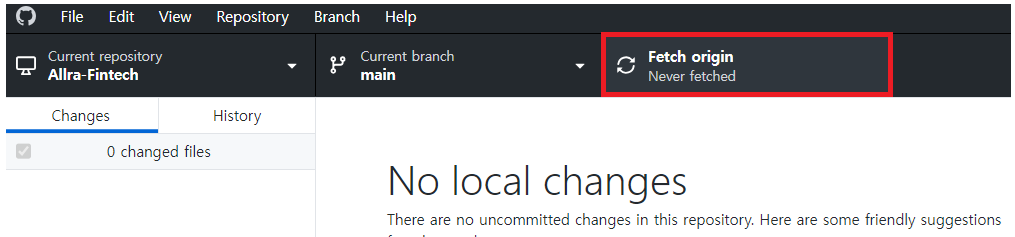 2. GitHub Desktop์ผ๋ก ์ด๋ํ์ฌ Fetch origin ๋ฒํผ์ ํด๋ฆญํ๋ค.