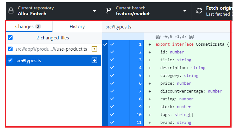 2. GitHub Desktop์ผ๋ก ๋์๊ฐ Changes ํญ์์ ์์ ๋ ํ์ผ๊ณผ ๋ด์ฉ์ ํ์ธํ๋ค.