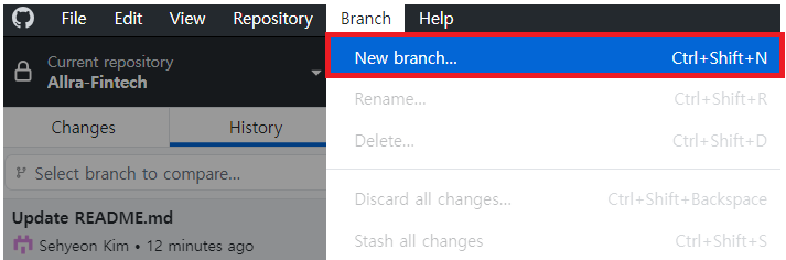 1. ์๋จ ๋ฉ๋ด์์ Branch > New branch๋ฅผ ์ ํํ๋ค.