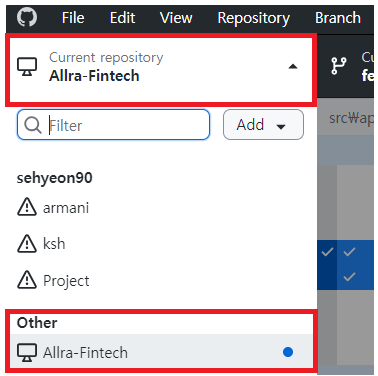 4. Current branch ๋ฒํผ์ ํด๋ฆญํ์ฌ ์์ฑ๋ ๋ธ๋์น์ ํ์ฌ ๋ธ๋์น๋ฅผ ํ์ธํ ์ ์๋ค.
