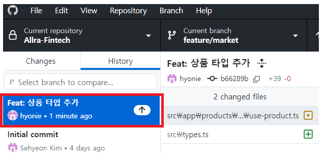 2. GitHub Desktop์ผ๋ก ๋์๊ฐ Changes ํญ์์ ์์ ๋ ํ์ผ๊ณผ ๋ด์ฉ์ ํ์ธํ๋ค.