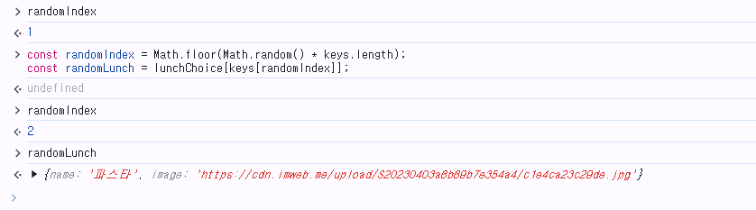 ์ด ์ฝ๋๋ฅผ ์คํํ๋ฉด lunchChoice ๊ฐ์ฒด ๋ด์ ๋๋คํ ์ ์ฌ ๋ฉ๋ด๋ฅผ randomLunch ๋ณ์์ ์ ์ฅํ๊ฒ ๋ฉ๋๋ค. ์ด ๊ฐ์ฒด์ name๊ณผ image ์์ฑ์ ํ์ฉํ์ฌ ์ฌ์ฉ์์๊ฒ ๋ณด์ฌ์ค ์ ์์ต๋๋ค.