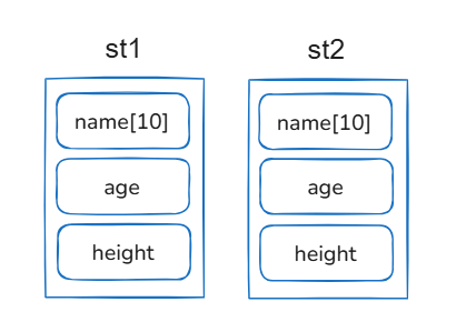 ์ด์ st1, st2 ๋ผ๋ ๊ตฌ์กฐ์ฒด ๋ณ์๊ฐ ๊ฐ๊ฐ 18๋ฐ์ดํธ(10 + 4 + 4)๋ฅผ ์ฐจ์งํ๋ฉฐ, ๋ด๋ถ ๋ฉค๋ฒ์ธ name, age, height๋ฅผ ํตํด ์ ๊ทผํ ์ ์์ต๋๋ค.