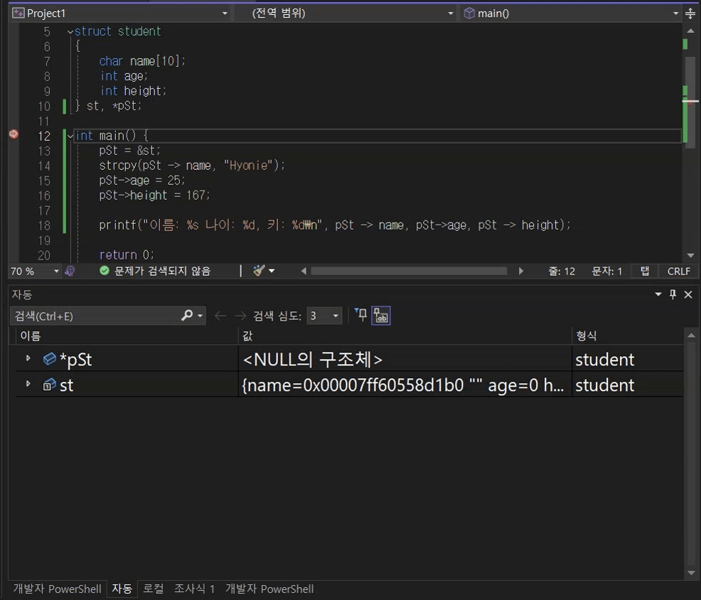 pSt = &st; // ๊ตฌ์กฐ์ฒด ๋ณ์์ ์ฃผ์๋ฅผ ํฌ์ธํฐ์ ์ ์ฅ