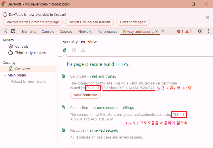 ๋ธ๋ผ์ฐ์ ์์ F12 → Networkํญ → ์์ฒญ ์ ํ → Security ํญ์ ๋ณด๋ฉด, ํ์ฌ ์์ฒญ์ด SSL๋ก ์ํธํ๋์๋์ง ํ์ธ ํ ์ ์์ต๋๋ค.