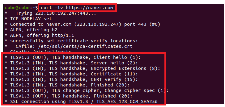 ๐ ๊ฒฐ๊ณผ์ค SSL connection using TLSv1.3 ๊ฐ์ ๋ฉ์์ง๊ฐ ๋์ค๋ฉด ์ํธํ ์ฑ๊ณต!