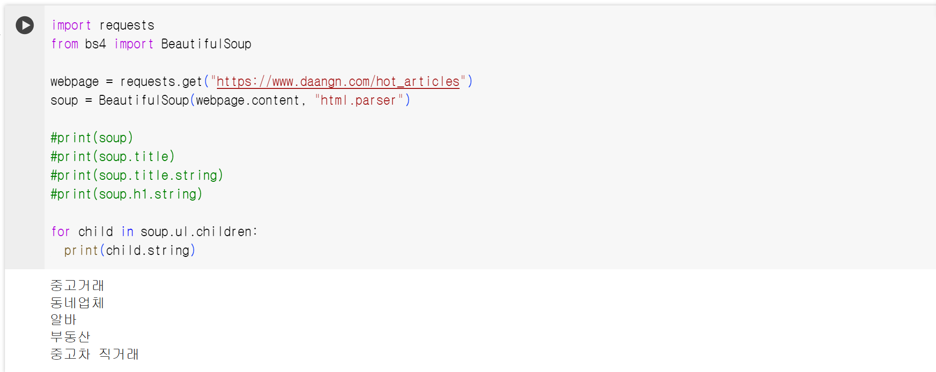 - `soup.ul.children` : ์ ์ฌ์ฉํ์ฌ ํ์ฑ๋ HTML๋ฌธ์์์ <ul> ํ๊ทธ์ ์์ ์์์ ๋ฌธ์์ด์ ์ถ๋ ฅํ๋ค.