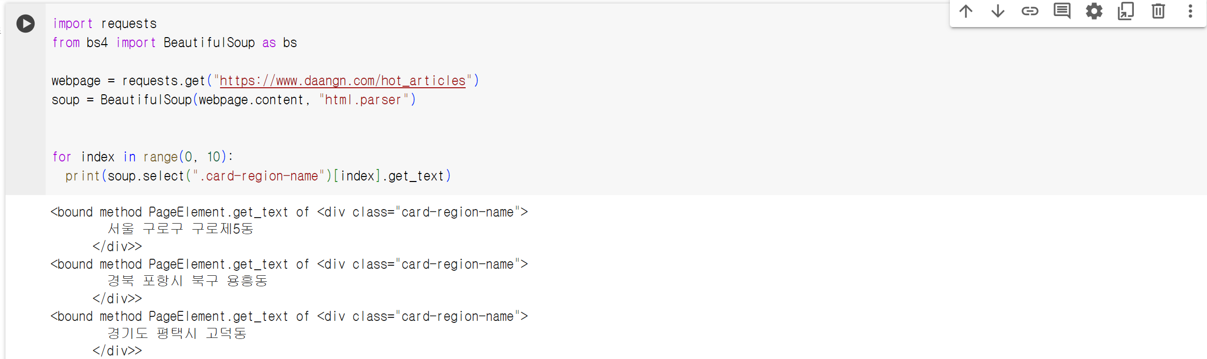 - BeautifulSoup ์ select() ํจ์๋ฅผ ํ์ฉํ์ฌ HTML ํด๋์ค๊ฐ card-region-name ์ธ ์์๋ค์ ์ ํํ๋ค. ๊ทธ๋ฐ ๋ค์ ๊ฐ ์์์์ .get_text()๋ฉ์๋๋ฅผ ํธ์ถํ์ฌ ํ ์คํธ๋ฅผ ์ถ์ถํ๊ณ ์ถ๋ ฅํ๋ค.
