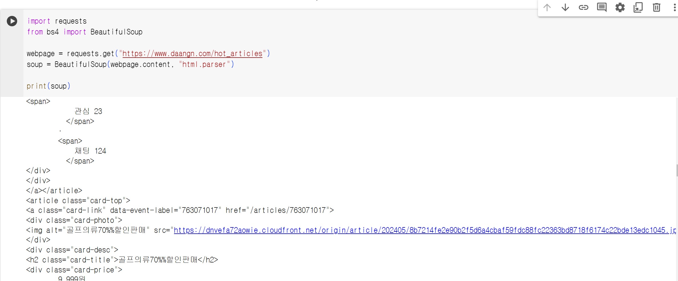 - doc์ ๋ด๊ธด HTML ํ์ผ์ ์ด์ด์ ํด๋น ๋ด์ฉ์ ๋ฌธ์์ด๋ก ์ฝ์ด์จ ํ์, BeautifulSoup ๋ผ์ด๋ธ๋ฌ๋ฆฌ๋ฅผ ์ฌ์ฉํ์ฌ ํ์ฑ๋ ๊ฒฐ๊ณผ๋ฅผ ํตํด ์ํ๋ ์ ๋ณด๋ฅผ ์ถ์ถํ ์ ์๋ค.