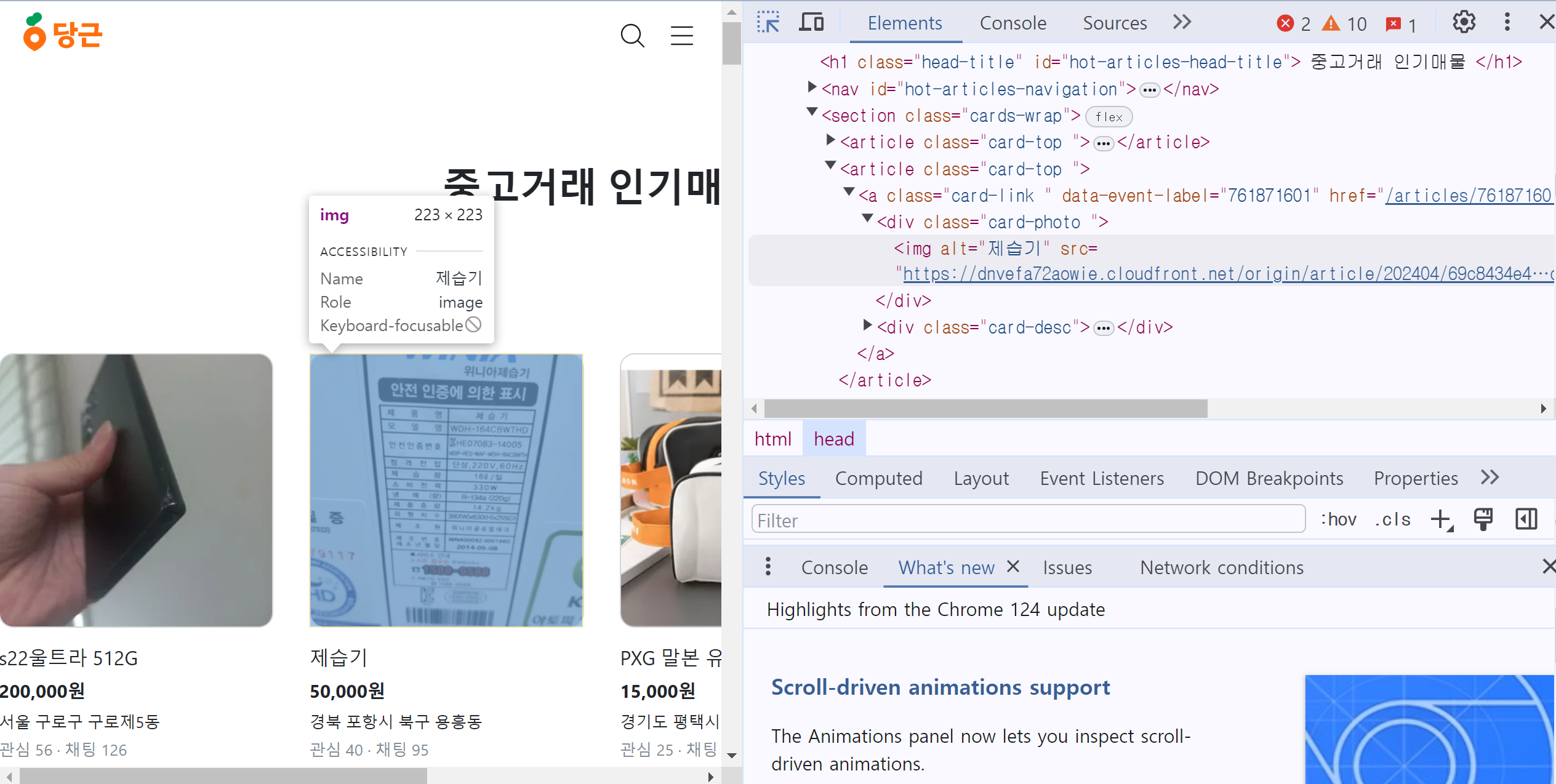 ํฌ๋กค๋ง์ ์งํํ ๋๋ ๊ฐ๋ฐ์ ๋๊ตฌ(F12)๋ฅผ ํ์ฉํ๋ ๊ฒ์ด ์ ์ฉํ๋ค. ๋ธ๋ผ์ฐ์ ์ ๊ฐ๋ฐ์ ๋๊ตฌ๋ฅผ ์ด๊ณ ์์๋ฅผ ๊ฒ์ํ๋ฉด ํ๊ทธ์ ๊ตฌ์กฐ์ ํด๋์ค๋ฅผ ํ์ธํ ์ ์๋ค. ์ด๋ฅผ ํตํด ์ด๋ค ํ๊ทธ๋ฅผ ์ฐพ์๋ด์ผ ํ๋์ง ํ์ ํ ์ ์๋ค.