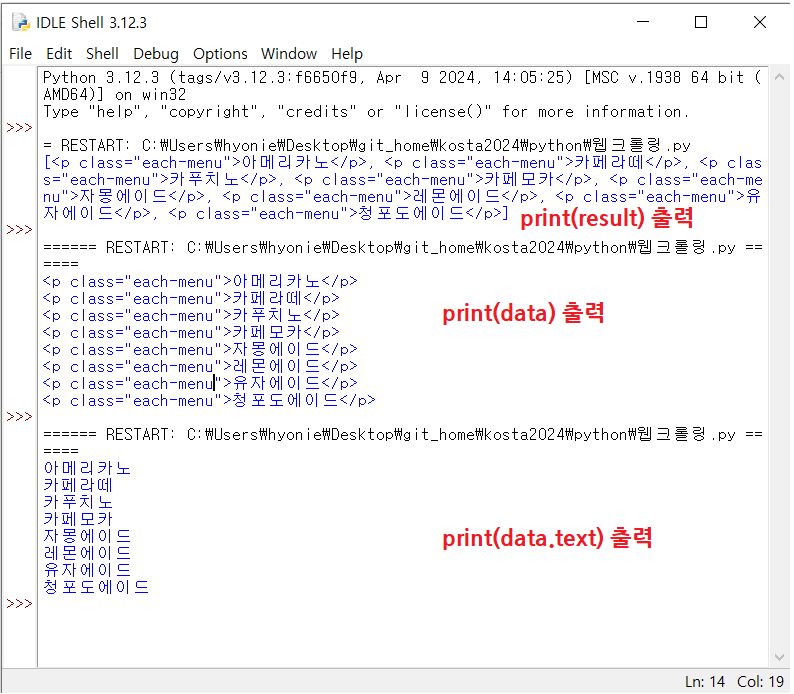- `print(data.text)` : BeautifulSoup ๊ฐ์ฒด์ธ data์ ํ ์คํธ ๋ด์ฉ๋ง ์ถ๋ ฅํ๋ค. ํ๊ทธ๊น์ง ๋์ค๋๊ฒ์ ์ํ์ง ์์๋๋ .text์์ฑ์ ์ฌ์ฉํ์ฌ ํด๋น ์์์ ํ ์คํธ ๋ด์ฉ๋ง ๋ฐํํ๋๋ก ํ๋ค.