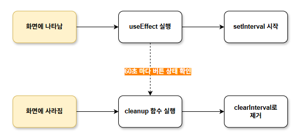 ๊ทธ๋์ ๊ทธ ์์ setInterval์ ๋ฃ์ผ๋ฉด ์ปดํฌ๋ํธ ๊ธฐ์ค์ผ๋ก ์์๋๊ณ ๋ฐ๋๋ก, ์ปดํฌ๋ํธ๊ฐ ํ๋ฉด์์ ์ฌ๋ผ์ง ๋๋ ์ ๋ฆฌ๋ ๊ฐ์ด ํ ์ ์์ต๋๋ค.