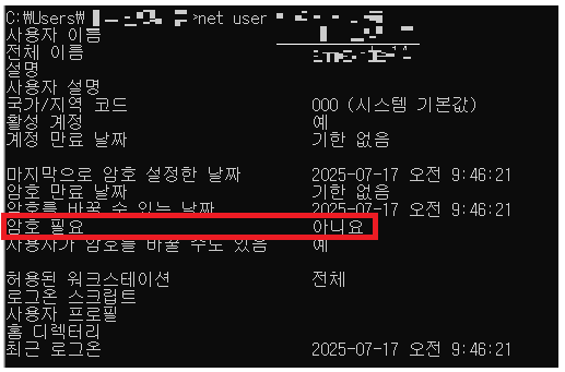 net user "์ฌ์ฉ์์ด๋ฆ" /passwordreq:yes