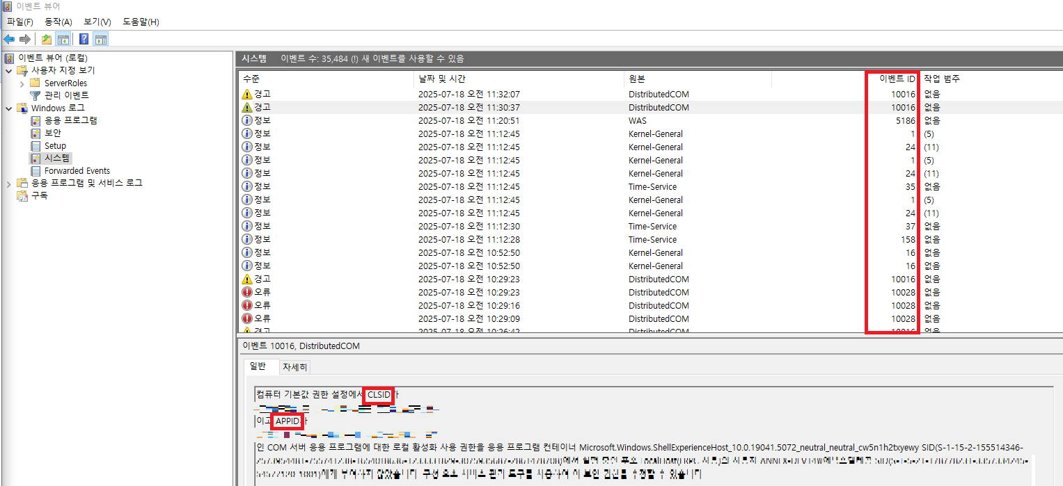 - ์ด๋ฒคํธ ๋ก๊ทธ ํ์ธ ๊ฒฐ๊ณผ ์ด๋ฒคํธ ID 10016, CLSID, APPID ๊ด๋ จ DCOM ๊ถํ ๋ถ์กฑ ์ค๋ฅ ๋ฐ์
