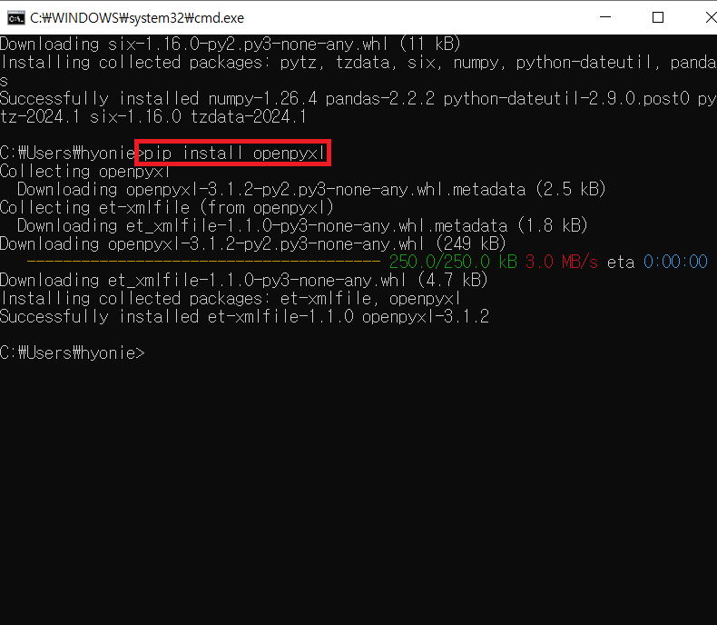 - ๋ค์ ๋ช ๋ น์ ์ฌ์ฉํ์ฌ openpyx์ ์ค์น