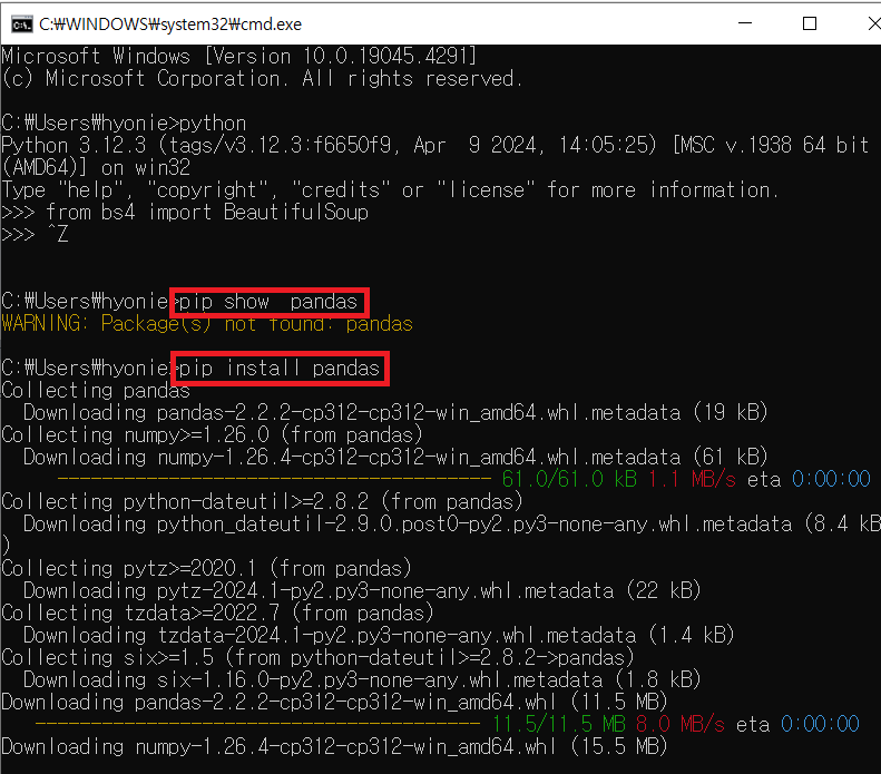 - ํจํค์ง ๊ด๋ฆฌ์ pip๋ฅผ ์ฌ์ฉํ์ฌ ์ค์น ํ์ธ pip show pands