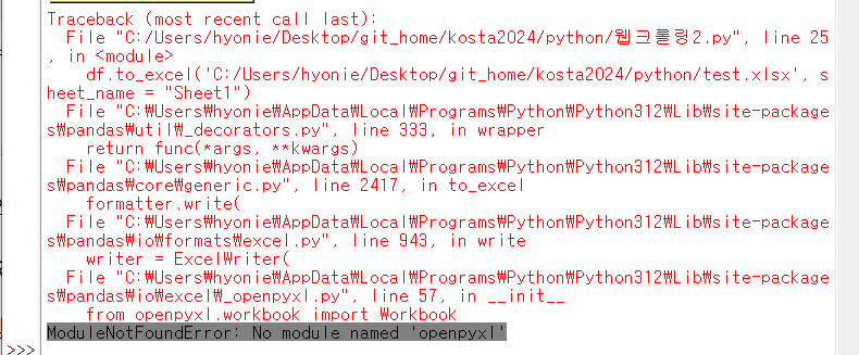 ํ๋ค์ค ๋ผ์ด๋ธ๋ฌ๋ฆฌ๋ง ์ค์นํ๋ฉด ๋๋ ์ค.. openpyxl ๋ชจ๋์ด ์์ด์ ์๋ฌ๊ฐ ๋ฐ์ํ๋ค.