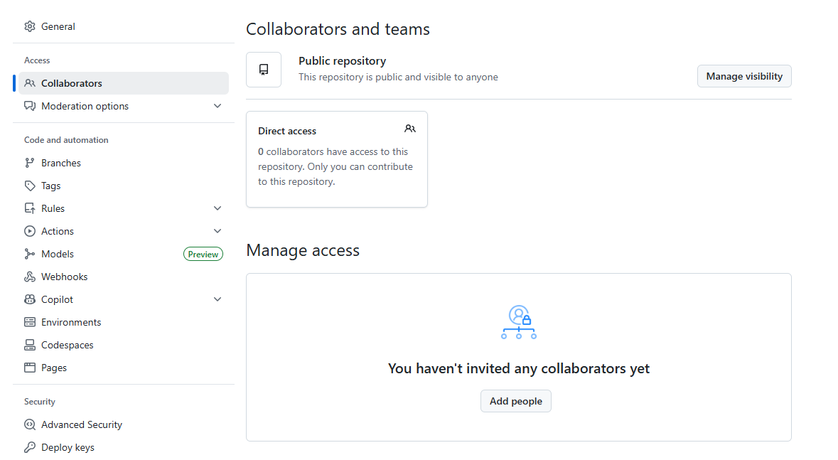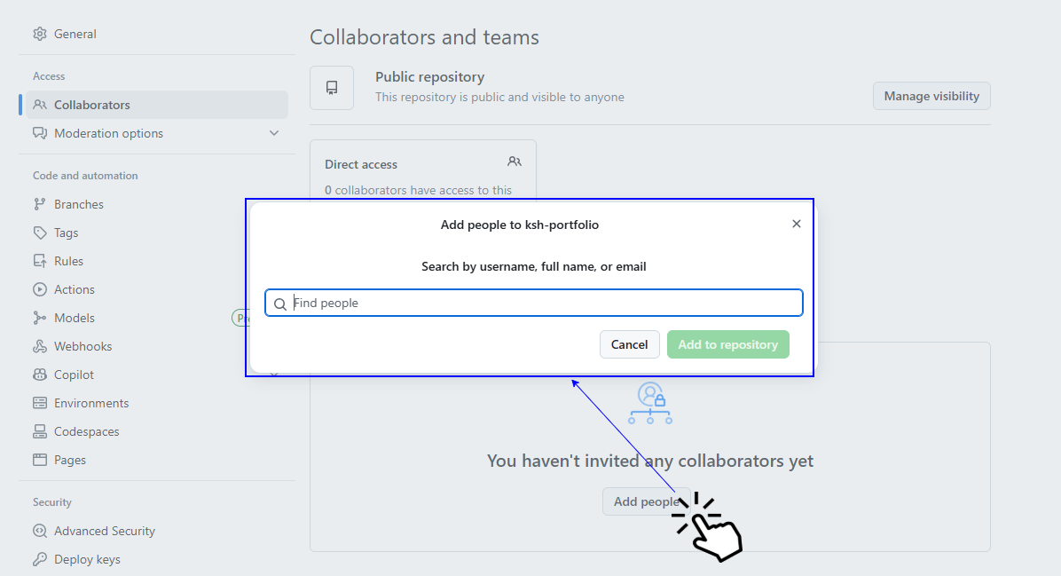 1. [GitHub ๋ ํฌ์งํ ๋ฆฌ] > Settings > Collaborators ์ด๋