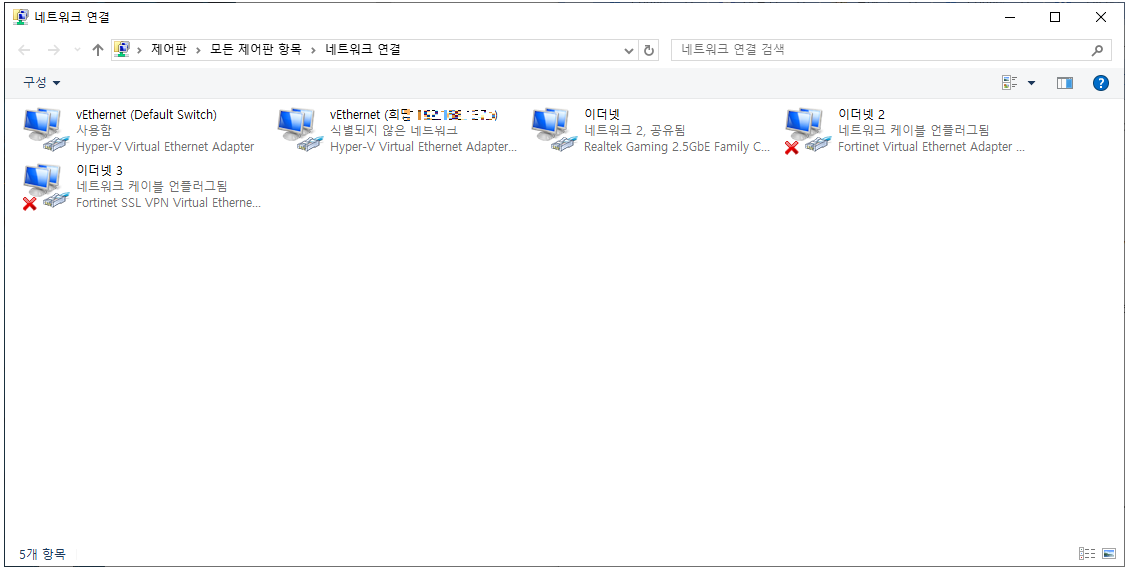 ์ด๊ณณ์์ ์ค์ ์ ์ /๋ฌด์ LAN ์ธ์ VMware, Hyper-V, VirtualBox, Docker, WSL, VPN, Loopback ์ด๋ํฐ ๋ฑ ๋ค์ํ ๊ฐ์ ๋คํธ์ํฌ ์ด๋ํฐ๋ฅผ ๋ณผ์ ์์ต๋๋ค.