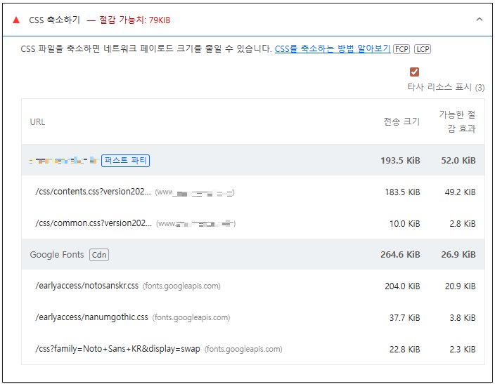 Lighthouse๋ ๋ถํ์ํ๊ฒ ํฐ CSS ํ์ผ๊ณผ ์ค๋ณต๋ Google Fonts import๋ฅผ ์ฑ๋ฅ ์ ํ ์์ธ์ผ๋ก ์ง์ ํ์ต๋๋ค.