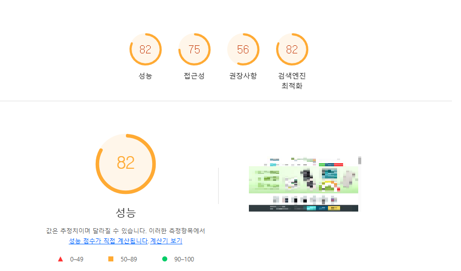 ์ต์ด ์ธก์ ๊ฒฐ๊ณผ ์ฑ๋ฅ ์ ์ 76์ ์ ๋ฐ์๊ณ , Lighthouse์์ ์ ์ํ ๊ฐ์ ์ฌํญ ์ค ์ผ๋ถ๋ฅผ ์ ์ฉํ์ฌ 82์ ๊น์ง ๋์ด์ฌ๋ฆด ์ ์์์ต๋๋ค.